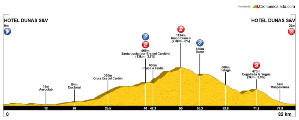 Salida desde el Hotel Oficial por GC-500 dirección Juan Grande, Vecindario, giro a izquierda por GC-65 hacia Era del Cardón, donde se inicia el primer puerto de la jornada con una longitud de 13 km hasta Santa Lucía de Tirajana donde reagruparemos y avituallaremos. En este punto los corredores que no deseen realizar el ascenso a Risco Blanco podrán continuar escoltados hasta Tunte y allí reagrupar y continuar la etapa con el resto del pelotón. El resto del pelotón girará a la derecha hacia Taidía para el ascenso inédito de Risco Blanco con alguna rampa sorpresa por el camino. Luego ligero descenso a Tunte por GC-60 donde avituallamos y seguimos siempre por GC-60 dirección Fataga, culminando el ascenso a la Degollada de la Yegüa y Maspalomas con meta en el Hotel Oficial.
