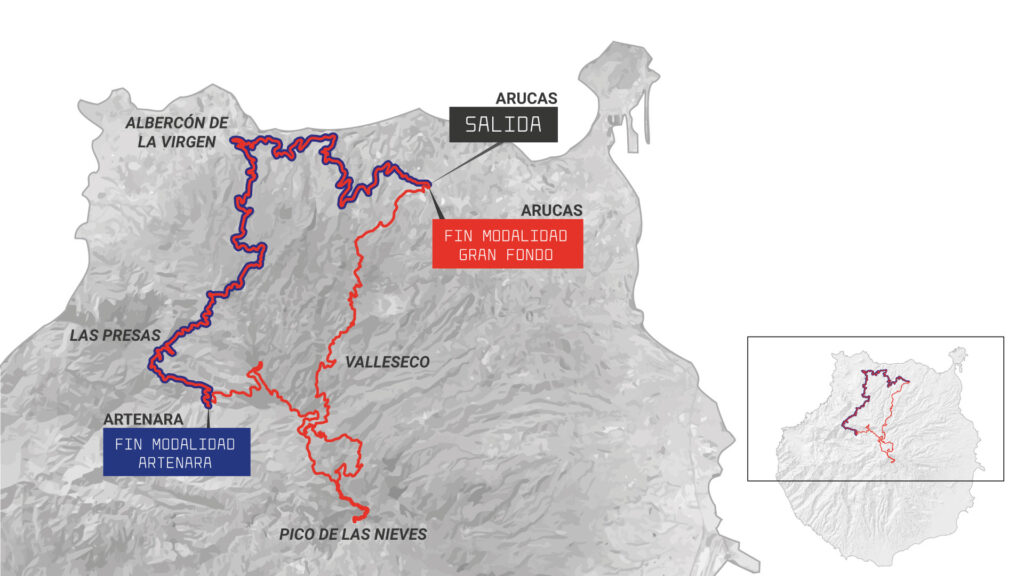Arucas – Buen Lugar – Pagador – Albercón de la Virgen – Fagajesto – Presas – Artenara – Pinos de Gáldar – Cruz de Tejeda – Cueva Grande – Pico de las Nieves – Cruz de Tejeda – Teror – Arucas