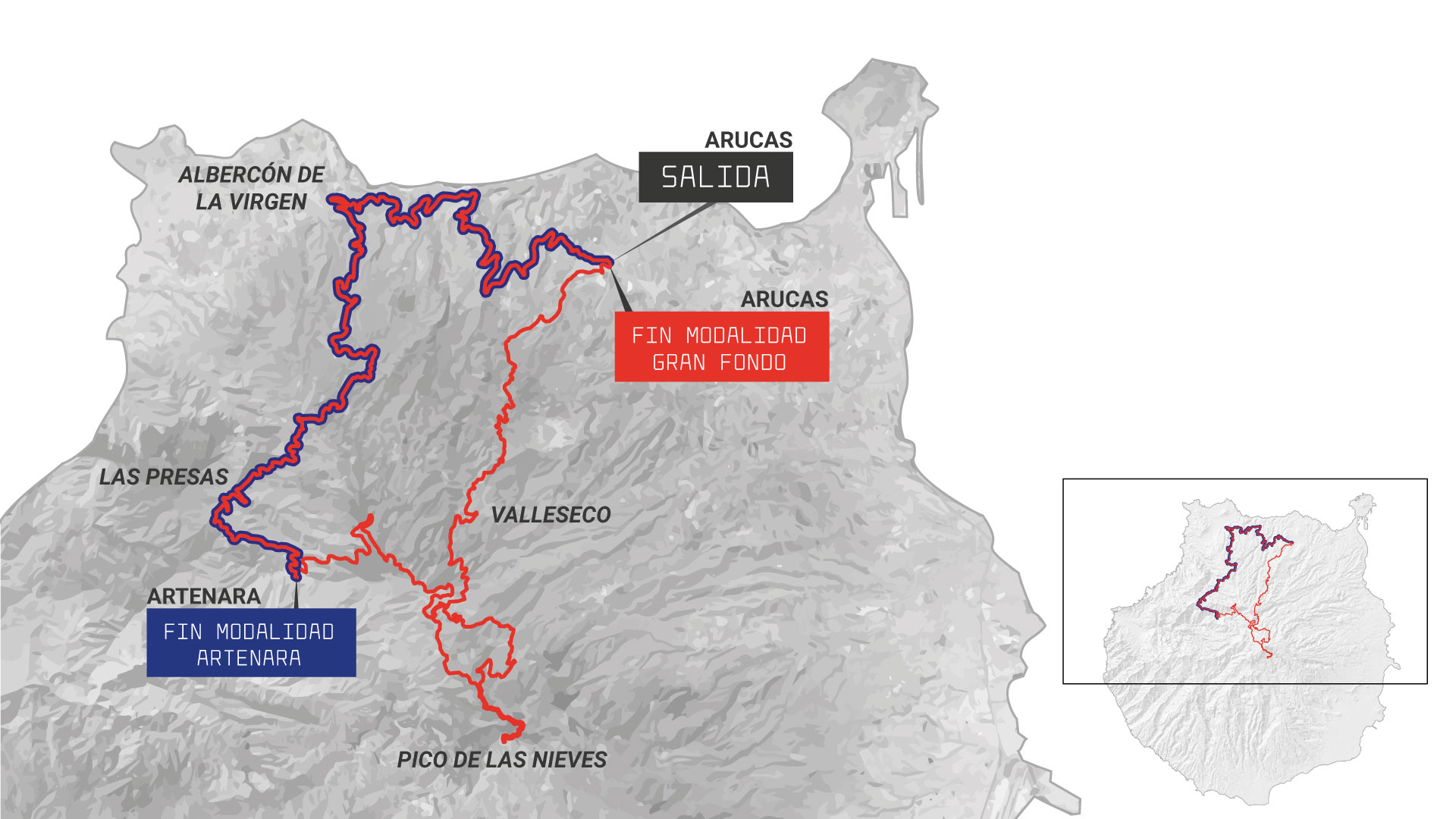 Una vez en Pico Las NIeves, la organización tapará los dorsales y escoltaremos a pequeños grupos de ciclistas hasta el punto de salida en Arucas, siendo obligatorio para poder clasificarse, pasar por el punto de medición allí dispuesto. El descenso acompañado se hará por Cruz de Tejeda, Cueva Corcho, Valleseco, Cruz de Firgas, Arucas (Plaza de San Juan) con un total de 125 km y 3.324 m de desnivel positivo.