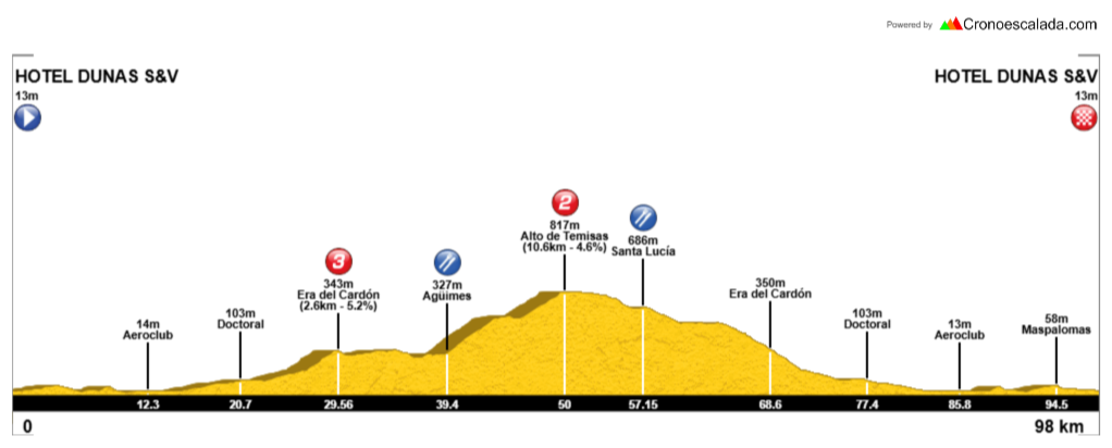 Salida hacia Temisas por GC-550 e inicio del ascenso al segundo puerto de la jornada, el Alto de Temisas. Reagrupamiento y avituallamiento general en Santa Lucía de Tirajana. Se retoma en descenso por GC-60 por Los Cuchillos, Era del Cardón y Vecindario. Seguimos ya por GC-500 dirección Juan Grande y Maspalomas con final en el Hotel Suites&Villas by Dunas.